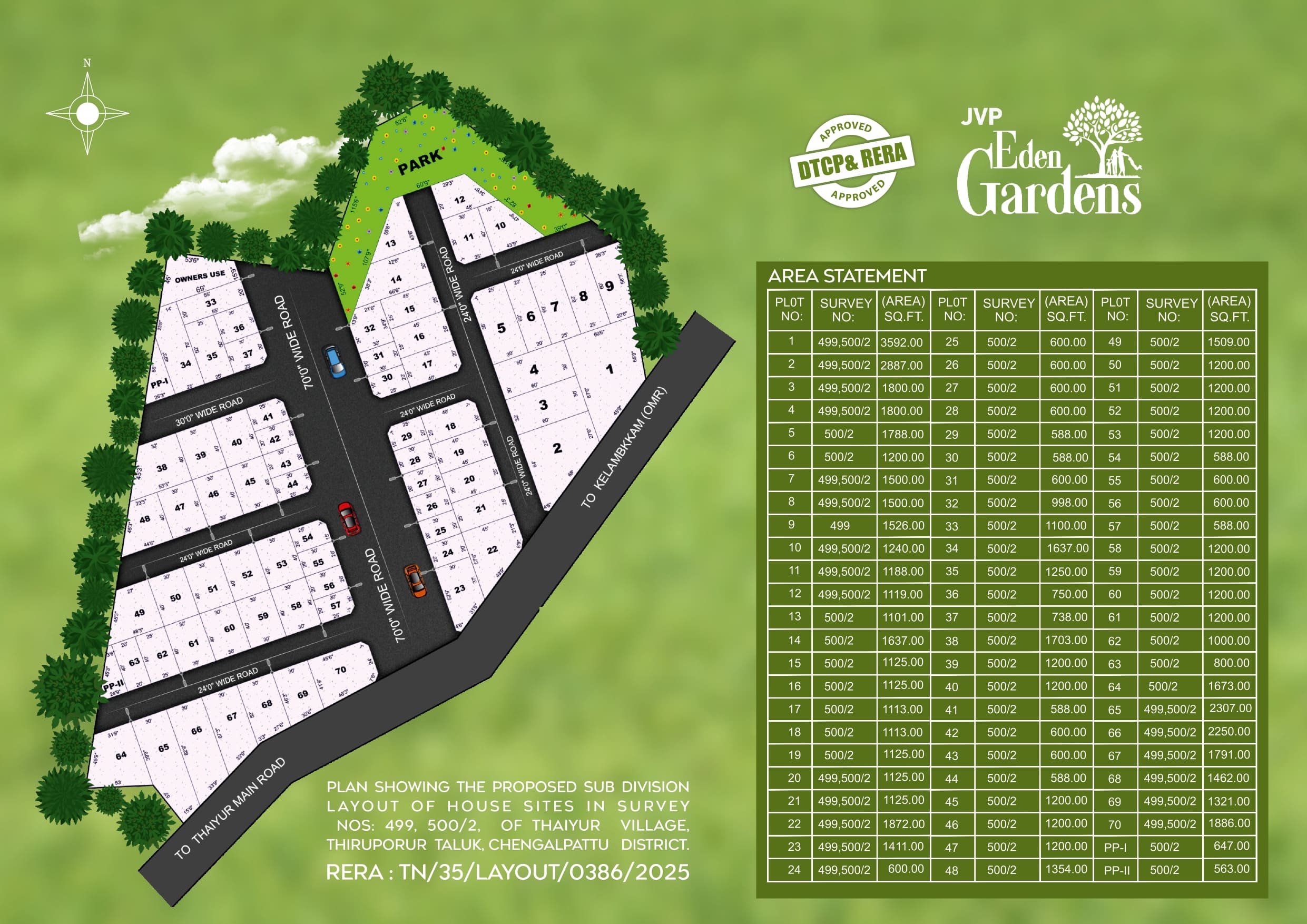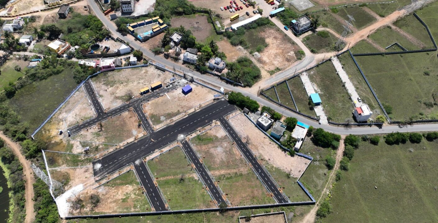 JVP Eden Gardens is a residential development situated on Thaiyur Main Road in Kelambakkam, along Chennai’s OMR corridor. This project offers DTCP and RERA-approved villa plots, providing a blend of quality, comfort, and luxury. Amenities include blacktop roads, avenue trees, solar street lights, and access to sweet water within 40 feet. The plots are ready for immediate construction, with features like a fully compounded layout and 24×7 security.